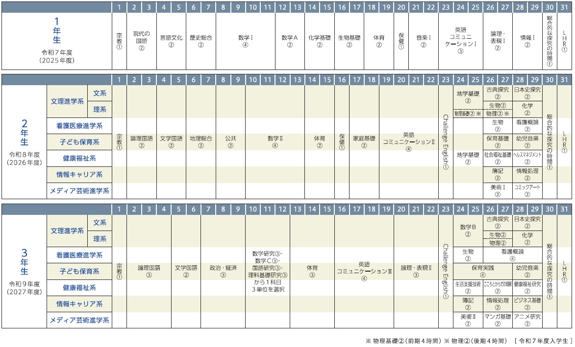 四年制大学、短期大学の理系学部への進学を目標に授業を展開します。理系は数学系の科目や生物または物理を履修し、入試対策のみならず進学後の対応も視野に入れて学習します。