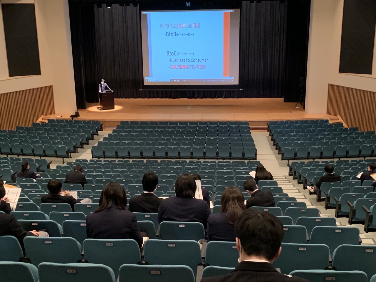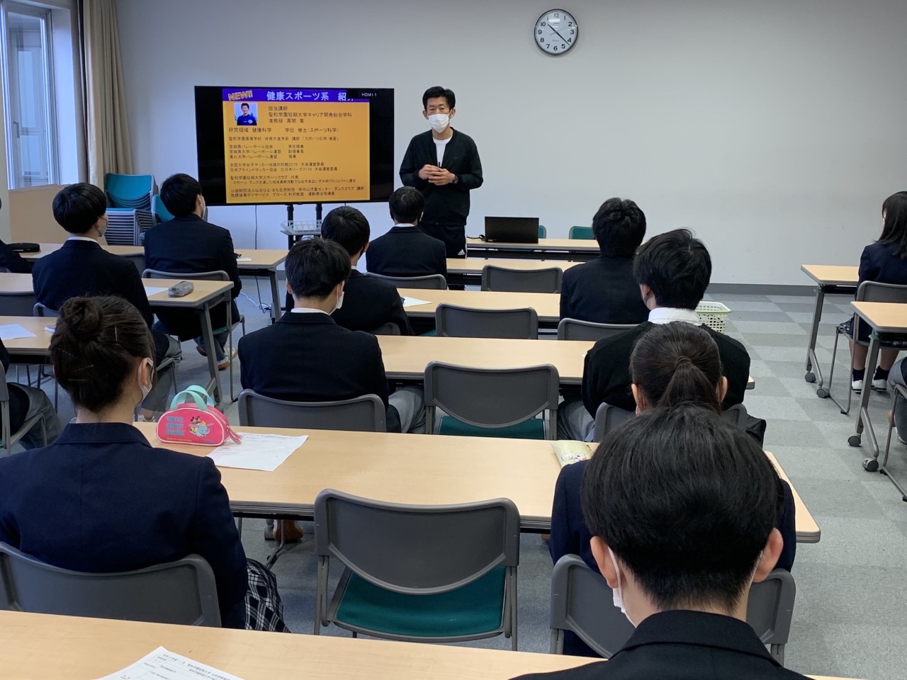 【薬師堂キャンパス】リベラルアーツコース、プログレスコース2学年対象「聖和学園短期大学 出前授業」 2021.11.17 | お知らせ分類: お知らせ リベラルアーツコース、プログレスコースの2年生を対象に聖和学園短期大学の先生方をお呼びし出前授業を行いました。 語学、ビジネス、スポーツの分野について大学の授業を実際に受ける貴重な時間となりました。 2年生のみなさんは進路選択の一助となることを期待しています。