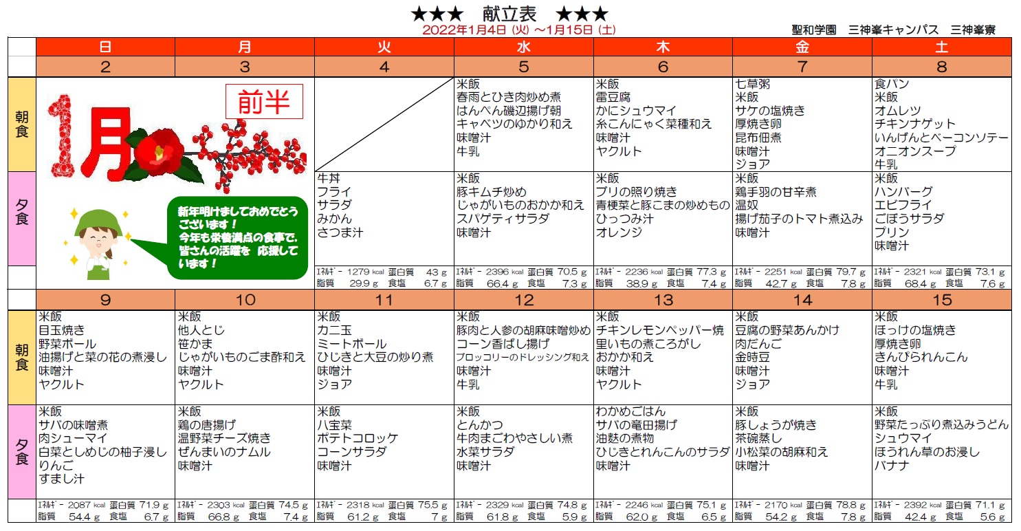 三神峯寮献立表(1月前半)
