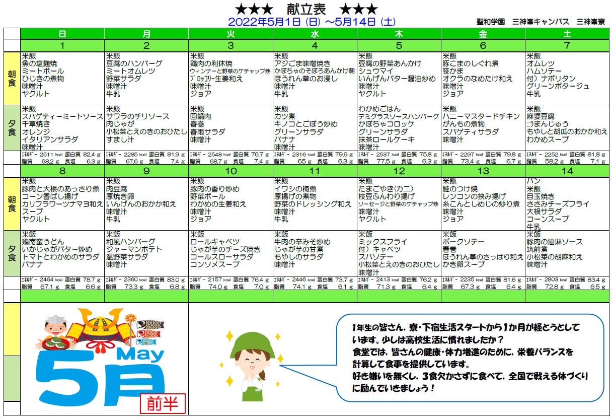 三神峯寮献立表(5月前半)