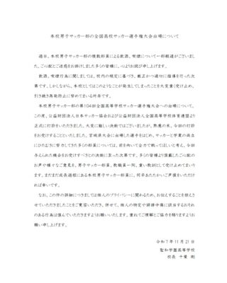 【男子サッカー部】第104回全国高等学校サッカー選手権大会出場について